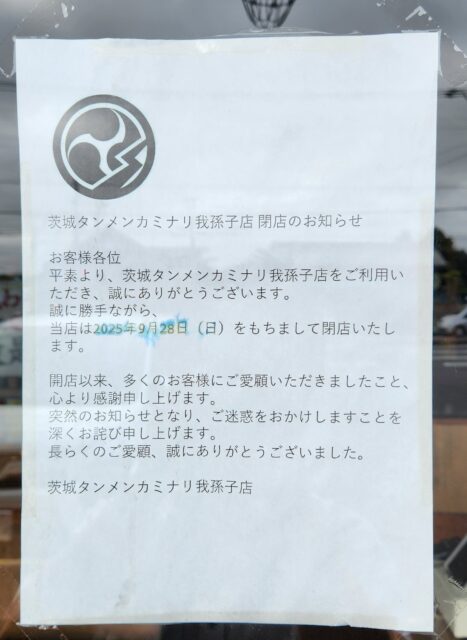 我孫子市高野山にあるから揚げ専門店からまるさん隣の茨城タンメンさんが9/28(日)をもって閉店していました。