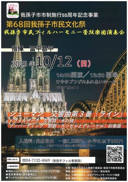 10/12(日) けやきプラザにて、我孫子市民フィルハーモニー管弦楽団演奏会が開催されます。