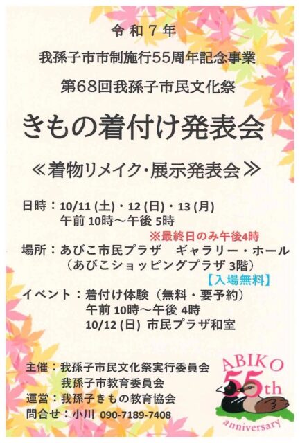 10/11(土)~13(月) あびこ市民プラザにて 【きもの着付け発表会】が開催されます