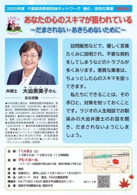 11/8(土)アビイホールにて「テレフォン人生相談」等でご活躍の大迫惠美子弁護士の講演会開催。参加申込受付中。