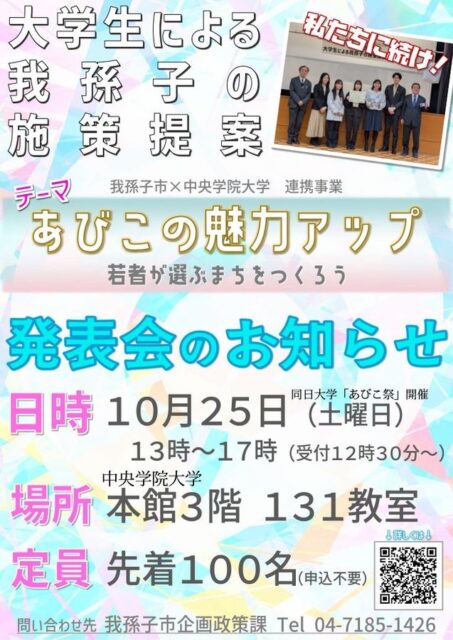 10/25(土)中央学院大学にて「我孫子の施策提案発表会」開催されます。