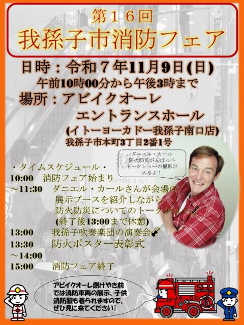11/9 アビイクオーレにて「我孫子市防災協会主催の消防フェア」が開催されます。
