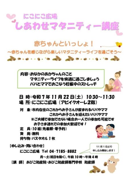 11/22土曜日 「しあわせマタニティー講座」 参加者募集(にこにこ広場)です。