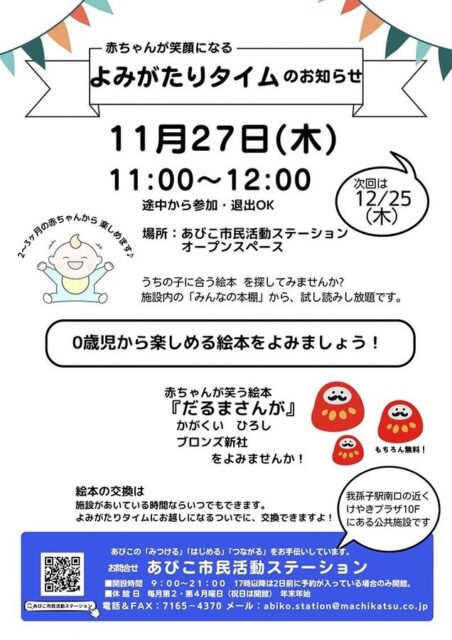 11/27 あびこ市民活動ステーションで「赤ちゃんが笑顔になるよみがたりタイム」開催