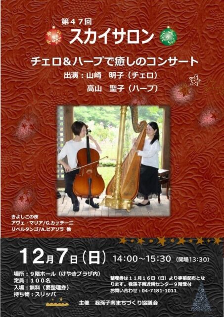 12/7 「チェロ&ハープで癒しのコンサート」が我孫子南近隣センター9階ホールにて開催【入場無料】