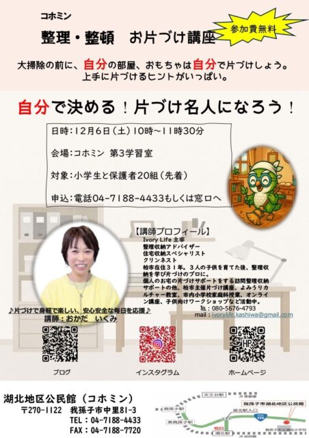 12/6 湖北地区公民館イベント「整理・整頓 お片づけ講座」開催されます