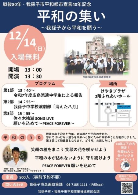 12/14 けやきプラザにて、「平和の集い ~我孫子から平和を願う~」開催されます。