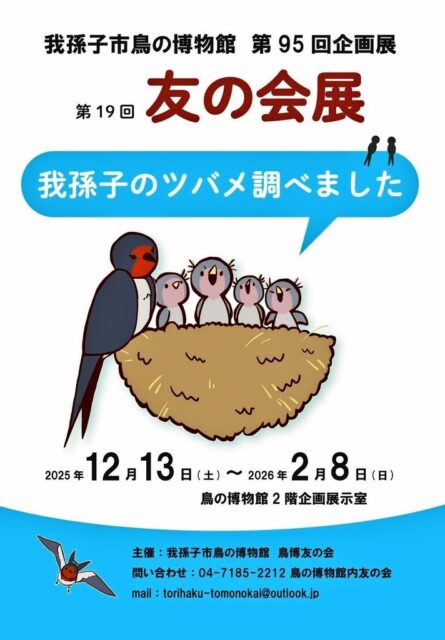 鳥の博物館にて、 第95回企画展「第19回友の会展 〜我孫子のツバメ調べました〜」開催中(12/13~2/8)