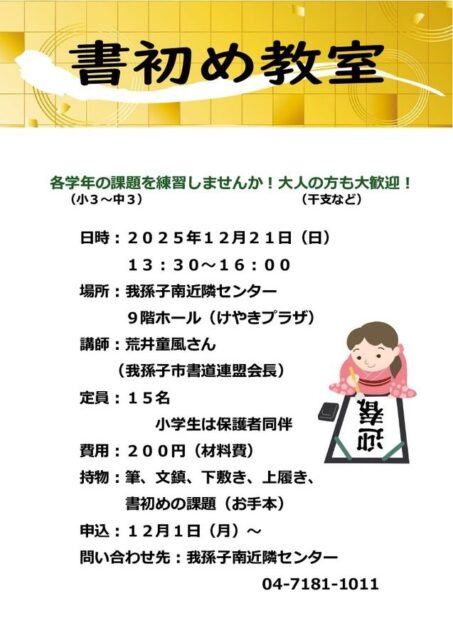12/21(日)我孫子南近隣センターで行われる「書初め教室」の申込受付中です。