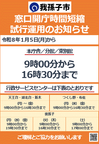 我孫子市では、1月5日(月)から窓口の開庁時間を試行的に変更しています。
