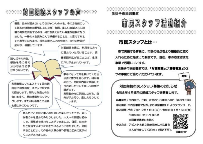 我孫子市図書館では、対面朗読事業に携わる市民スタッフを募集しています。