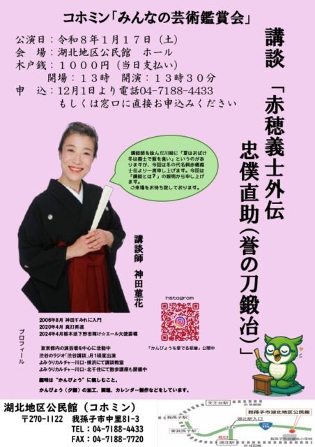 1/17(土)湖北地区公民館ホールにて「講談 赤穂義士外伝 忠僕直助(誉の刀鍛冶)」開催
