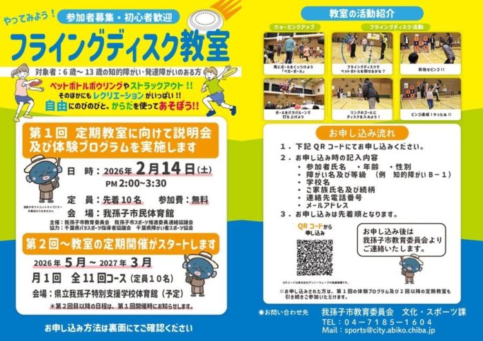 2/14我孫子市民体育館にて、知的・発達障害のある方を対象に「フライングディスク教室」 説明会・体験プログラムがおこなわれます。