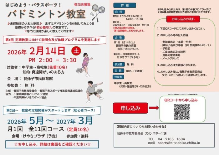 /14我孫子市民体育館にて、知的・発達障害のある方を対象に「バドミントン教室」 説明会・体験プログラムがおこなわれます。