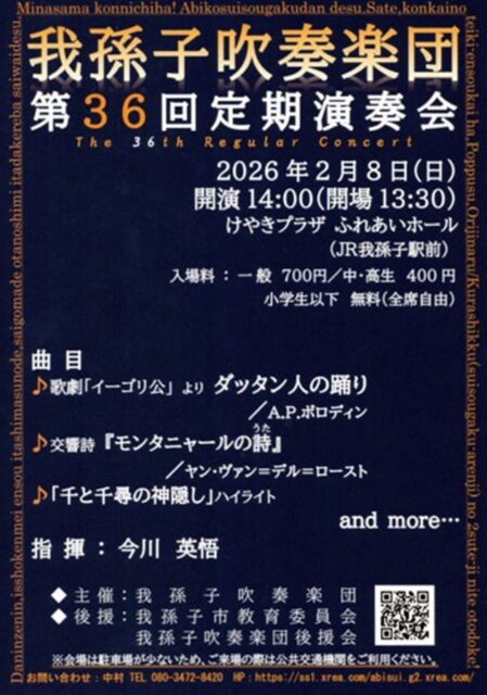 2月8日㈰ けやきプラザ にて、我孫子吹奏楽団 第36回定期演奏会開催されます。