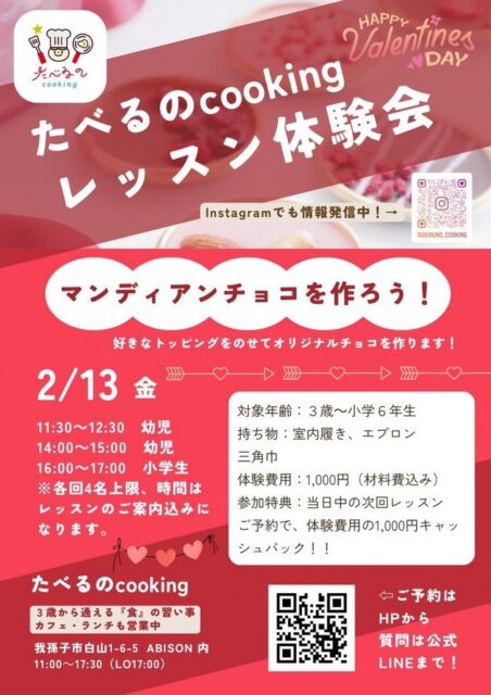 2/13(金)たべるのcooking体験会「マンディアンチョコ作り」開催されます。