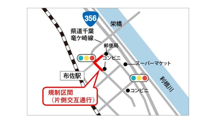 我孫子市布佐地先で令和9年2月まで交通規制が行われています。