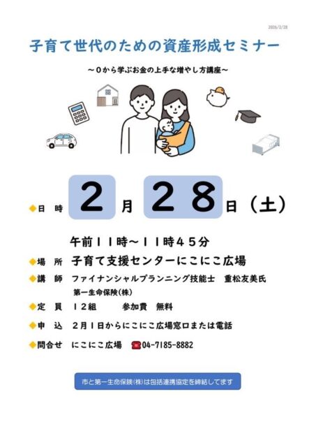2/28(土) 子育て支援センターにこにこ広場にて「子育て世代のための資産形成セミナー」が開催されます