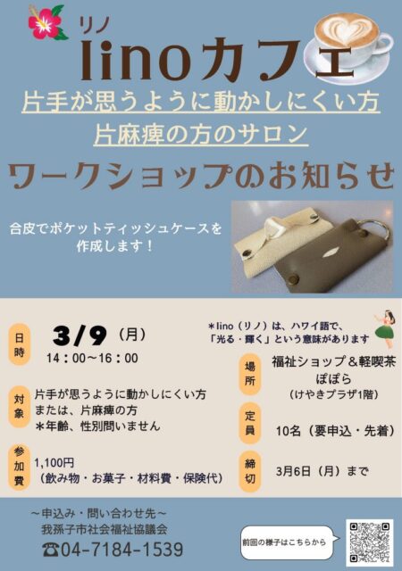 3/9月曜 「lino(リノ)カフェ~片手が思うように動かしにくい方・片麻痺の方のためのサロン~」開催